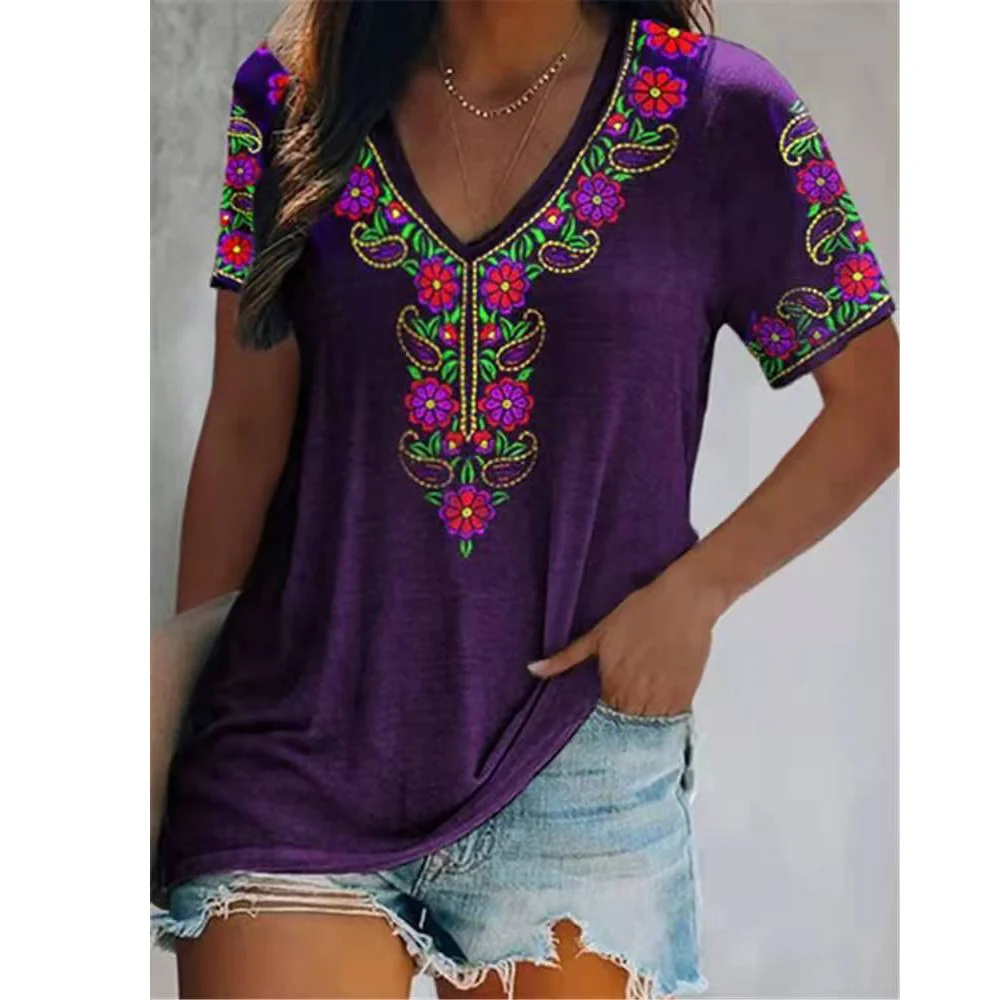 2024 Hot selling summer women’s top on Amazon in Europe and America, Bohemian printed V-neck short sleeved T-shirt for women