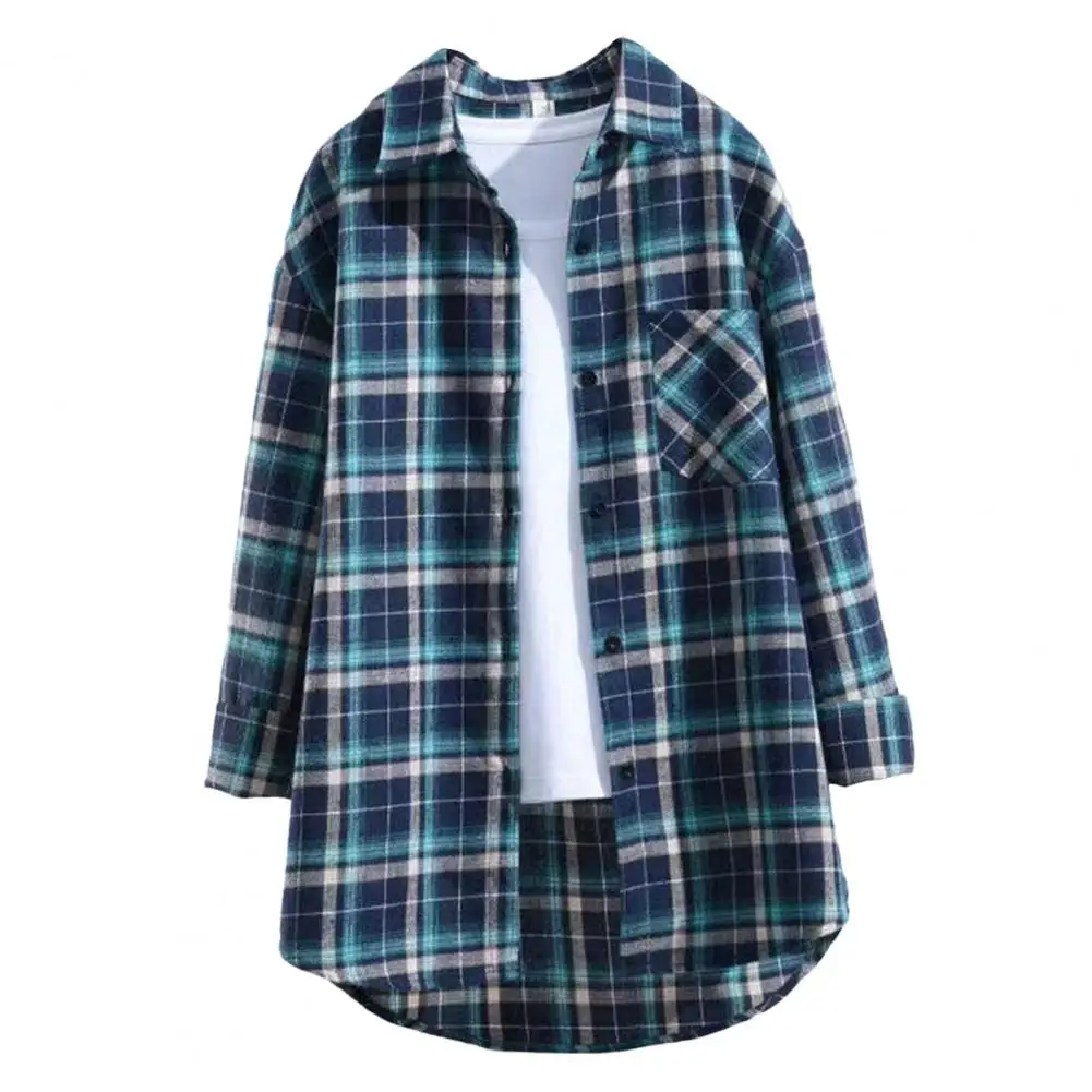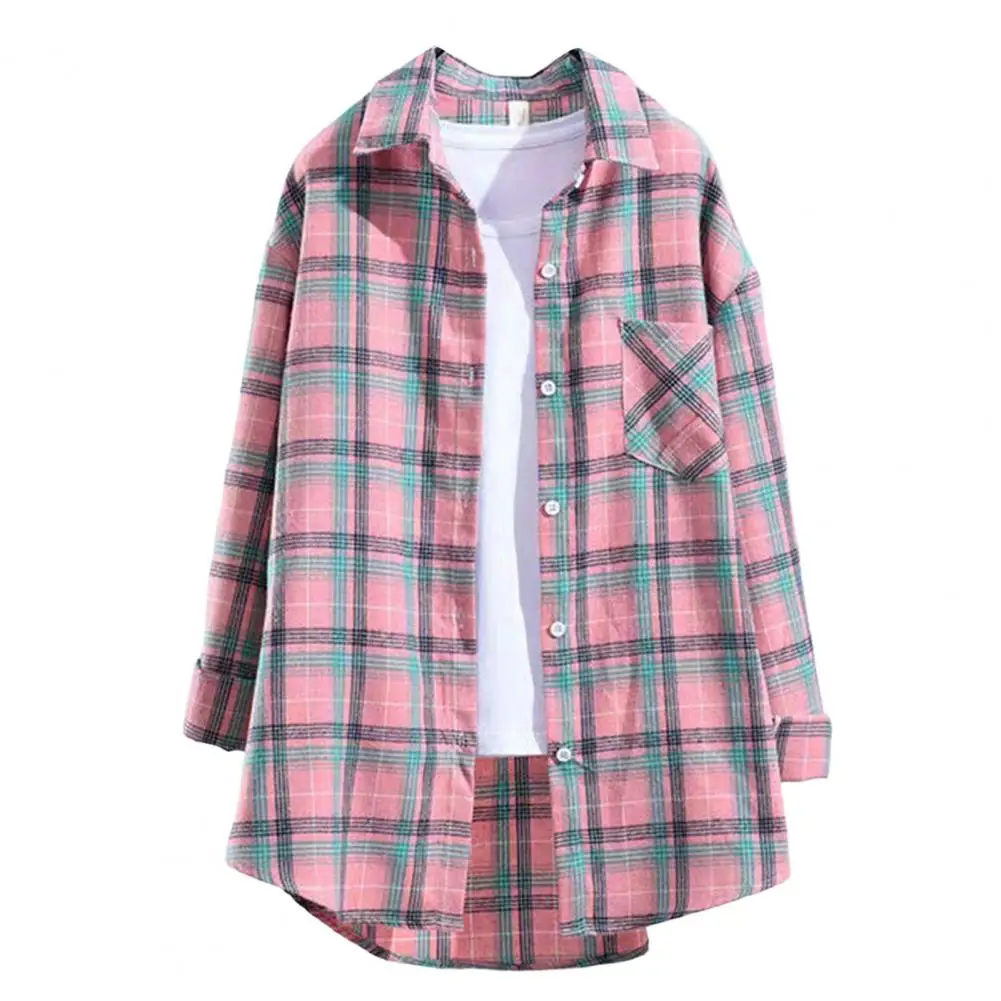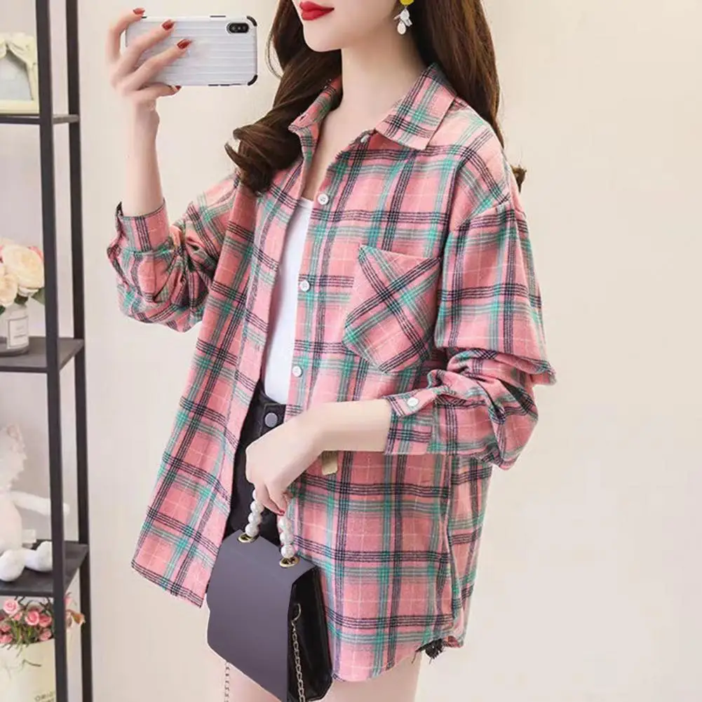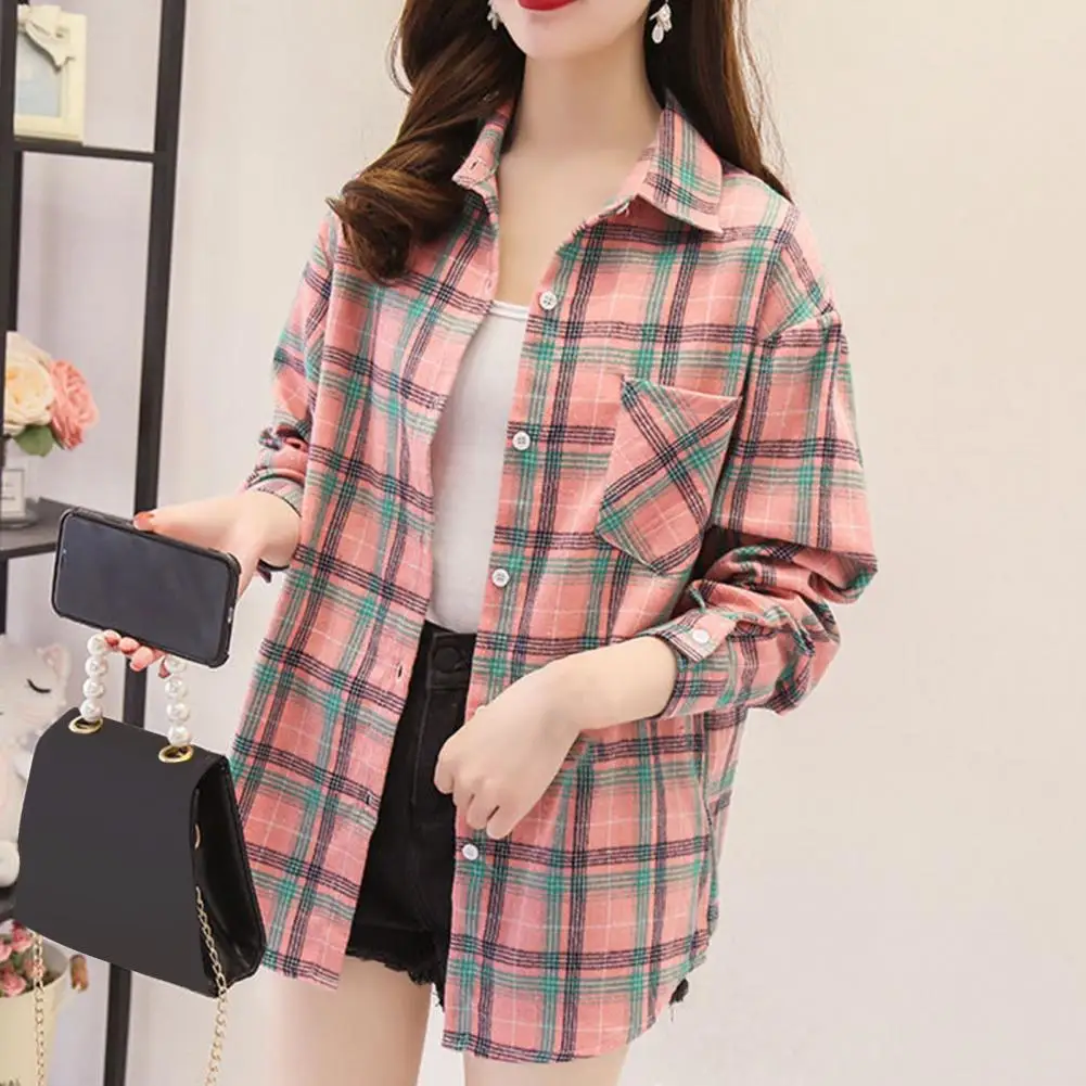 Turn Down Collar Long Sleeve Single-breasted Patch Pocket Loose Shirt Classic Plaid Print Casual Shirt Blouse Female Clothing