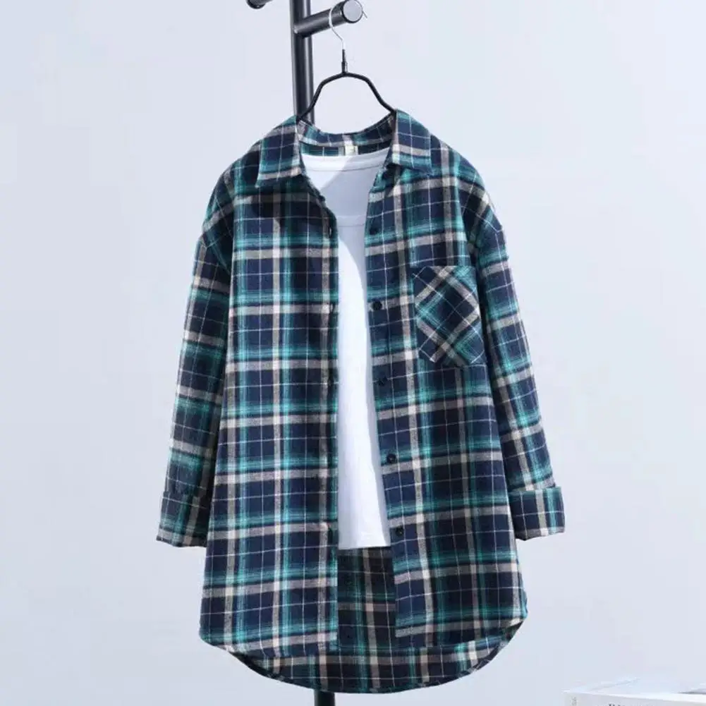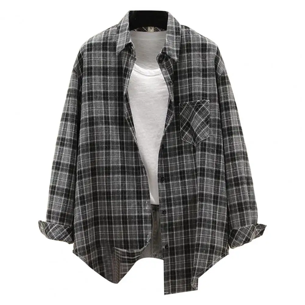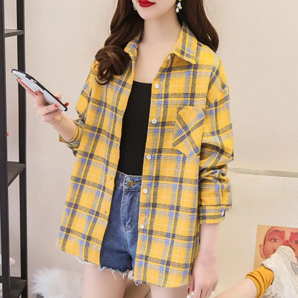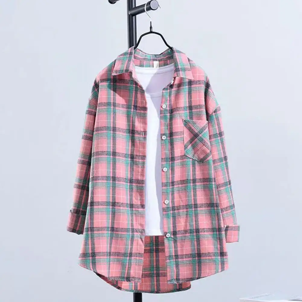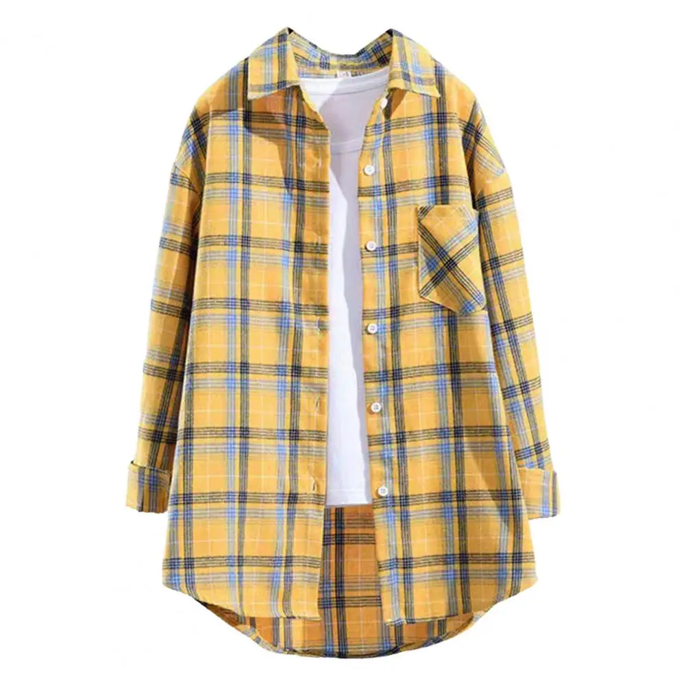 Turn Down Collar Long Sleeve Single-breasted Patch Pocket Loose Shirt Classic Plaid Print Casual Shirt Blouse Female Clothing