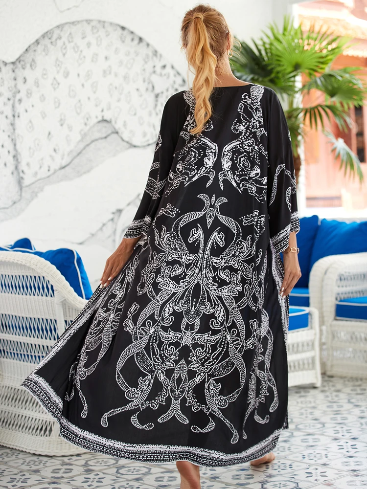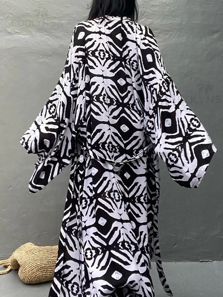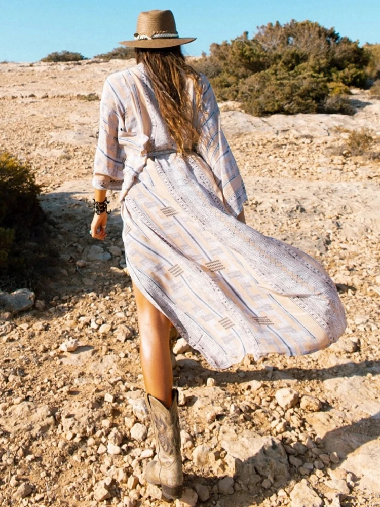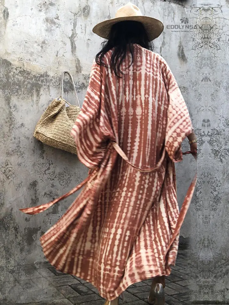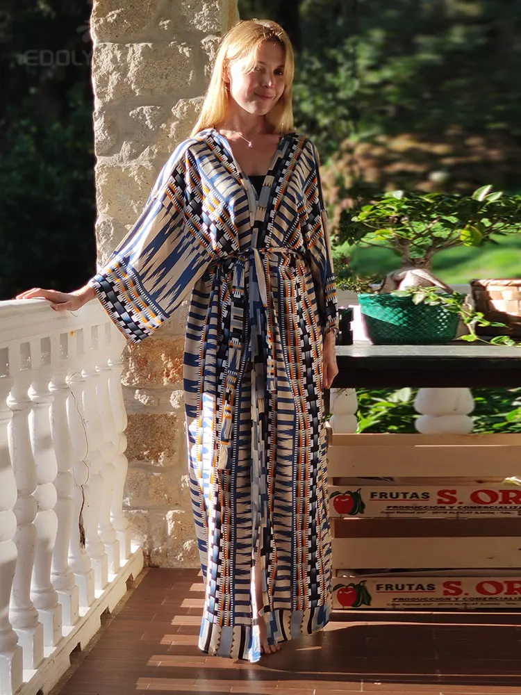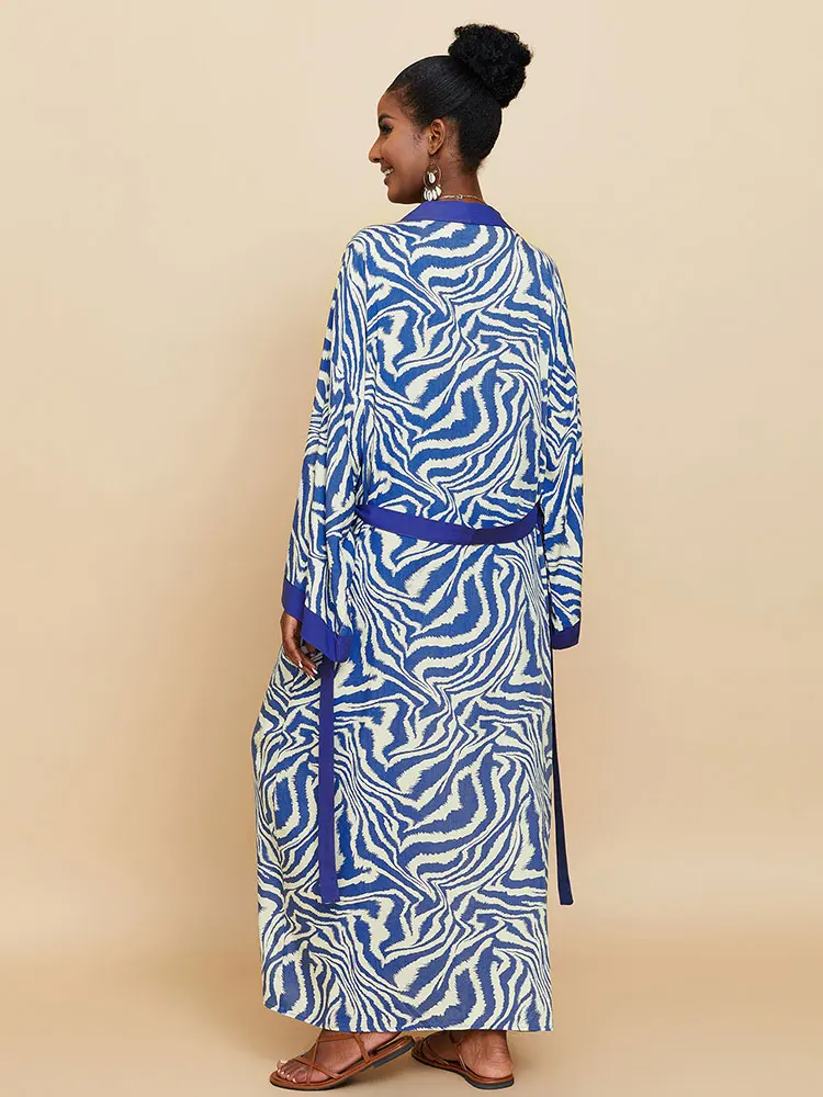 2025 Blue Retro Printed Long Sleeve Self Belted Plus Size Bohemian Kimono Tunic Women Tops and Blouses Shirts Q1228