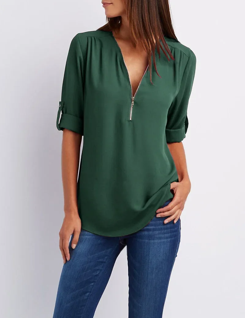 2025 Hot Sale Women Cool Loose Shirt Deep V Neck Chiffon Fashion Blouse Casual Ladies Tops Sexy Zipper Pullover Plus Size