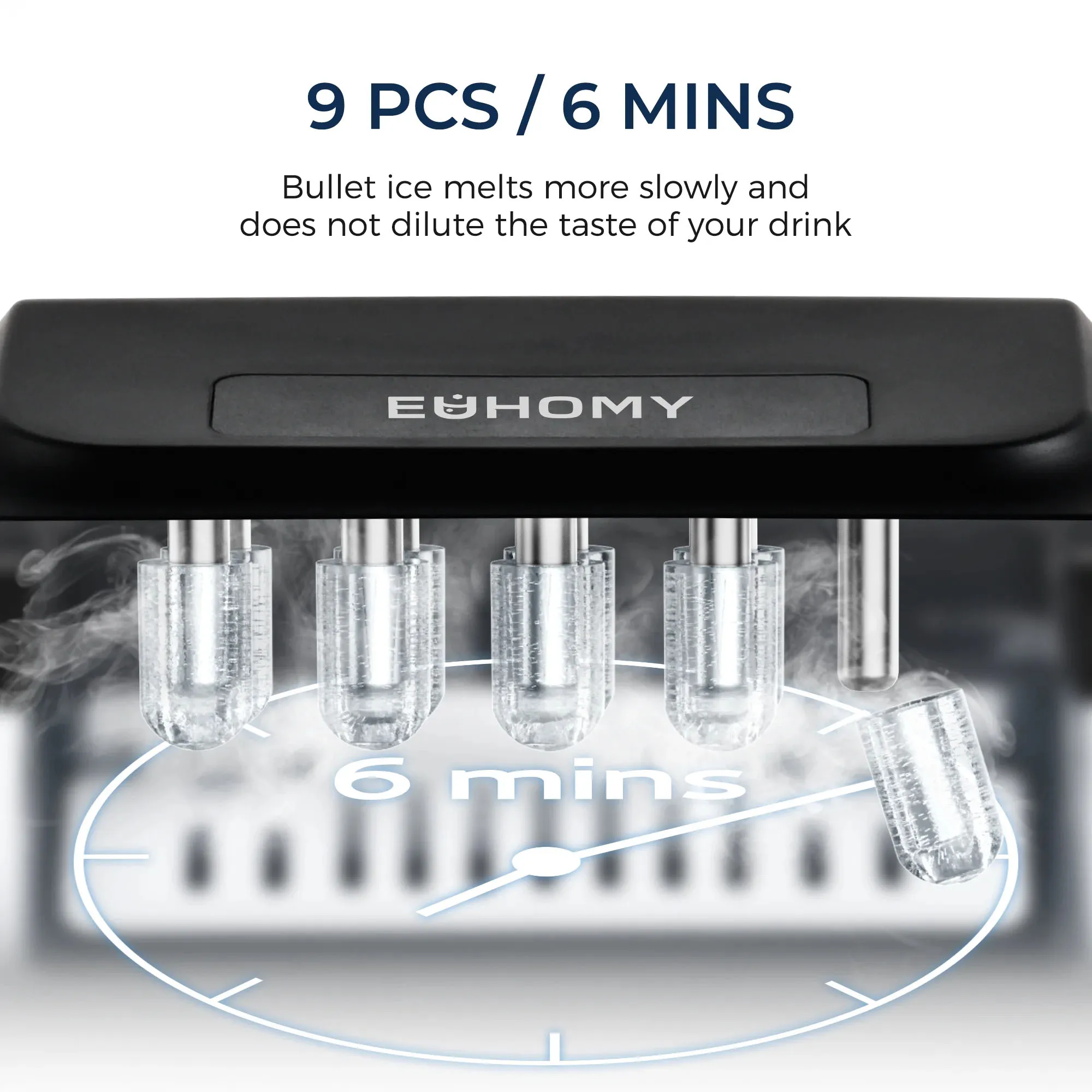 Rapid Ice-Making & Whisper-Quiet Operation:Experience ice perfection in just 6 minutes with our ice maker, producing 9 bullet-shaped ice cubes. Operating at a noise level under 45 dB, this portable ice maker ensures a serene ambiance while churning out a maximum of 26.5 lbs of ice per day, with a 1.3 lbs ice storage capacity.