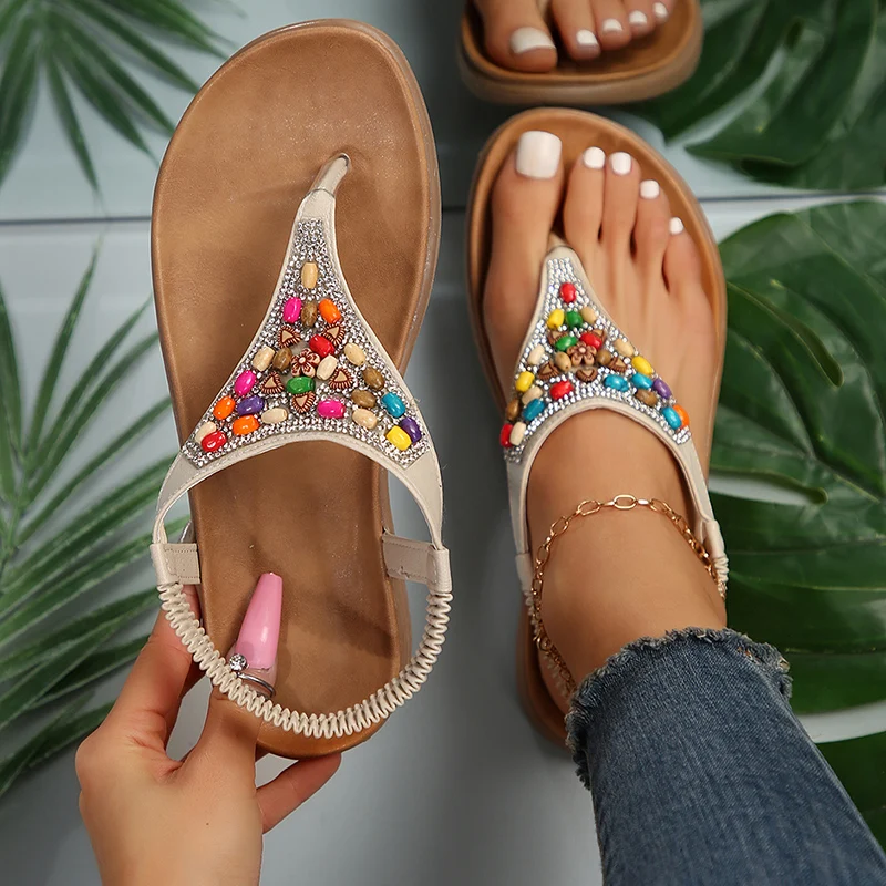 Retro Bohemian Flat Heels Sandals for Women 2024 summer Rhinestone Beads Clip Toe Sandals Woman Lightweight Beach Flip Flops