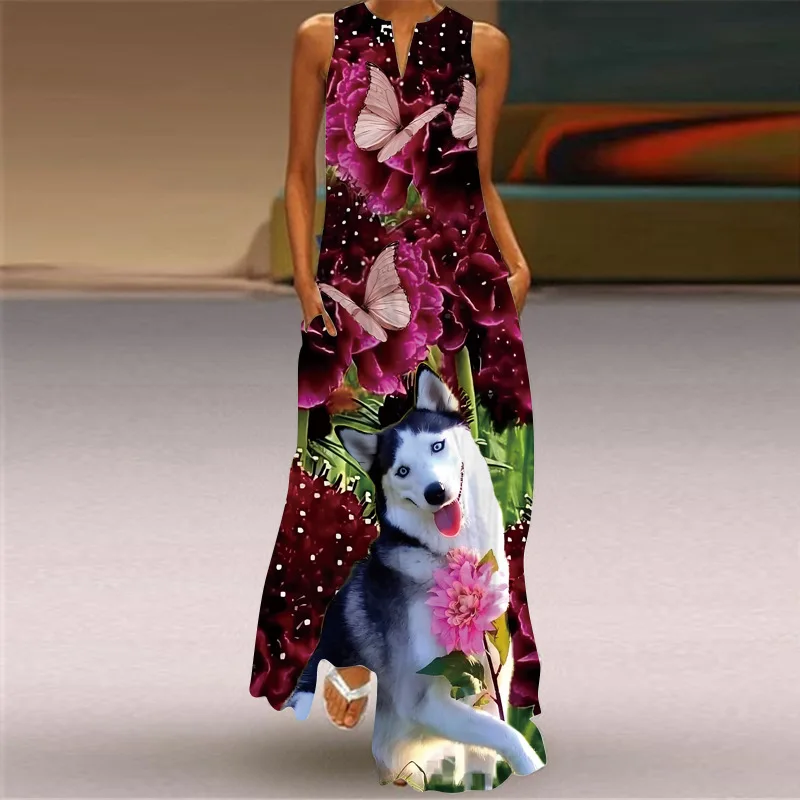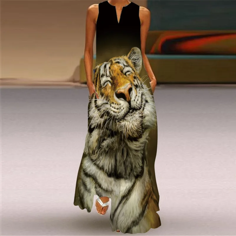 Vintage Print Maxi Dress For Women Summer Loose Sleeveless Long Dresses Elegant Lady V Neck Pocket Boho Beach Sundress Vestidos