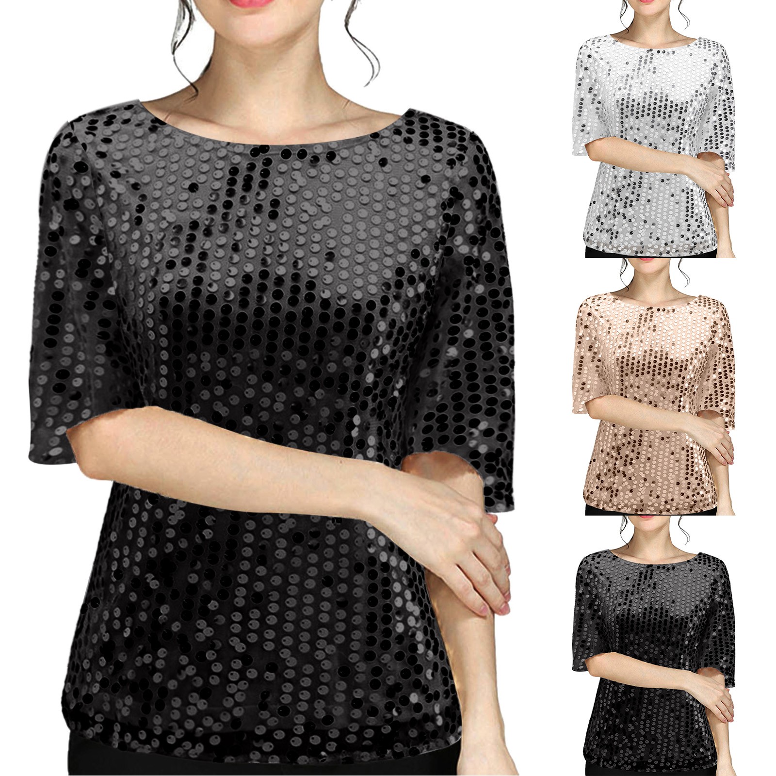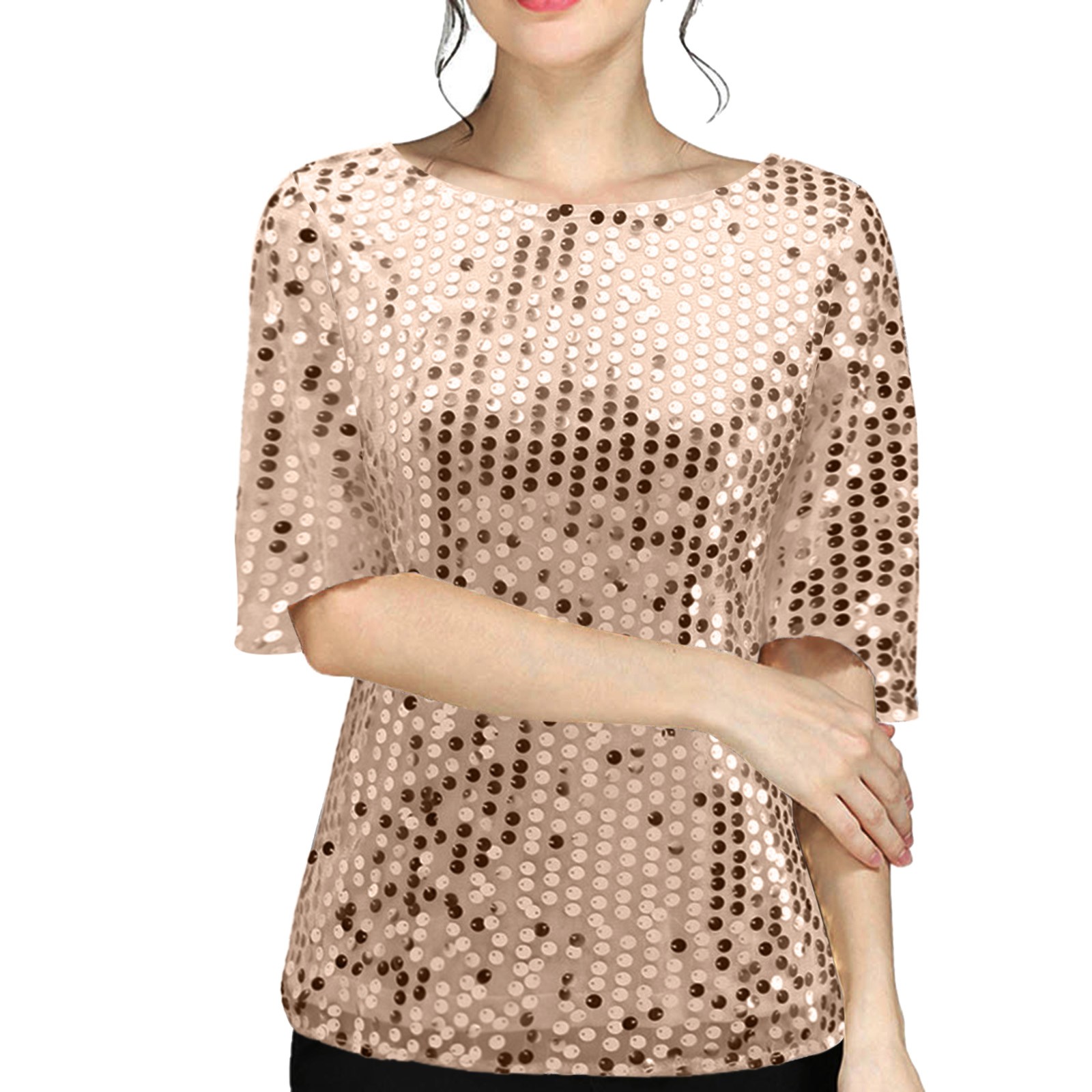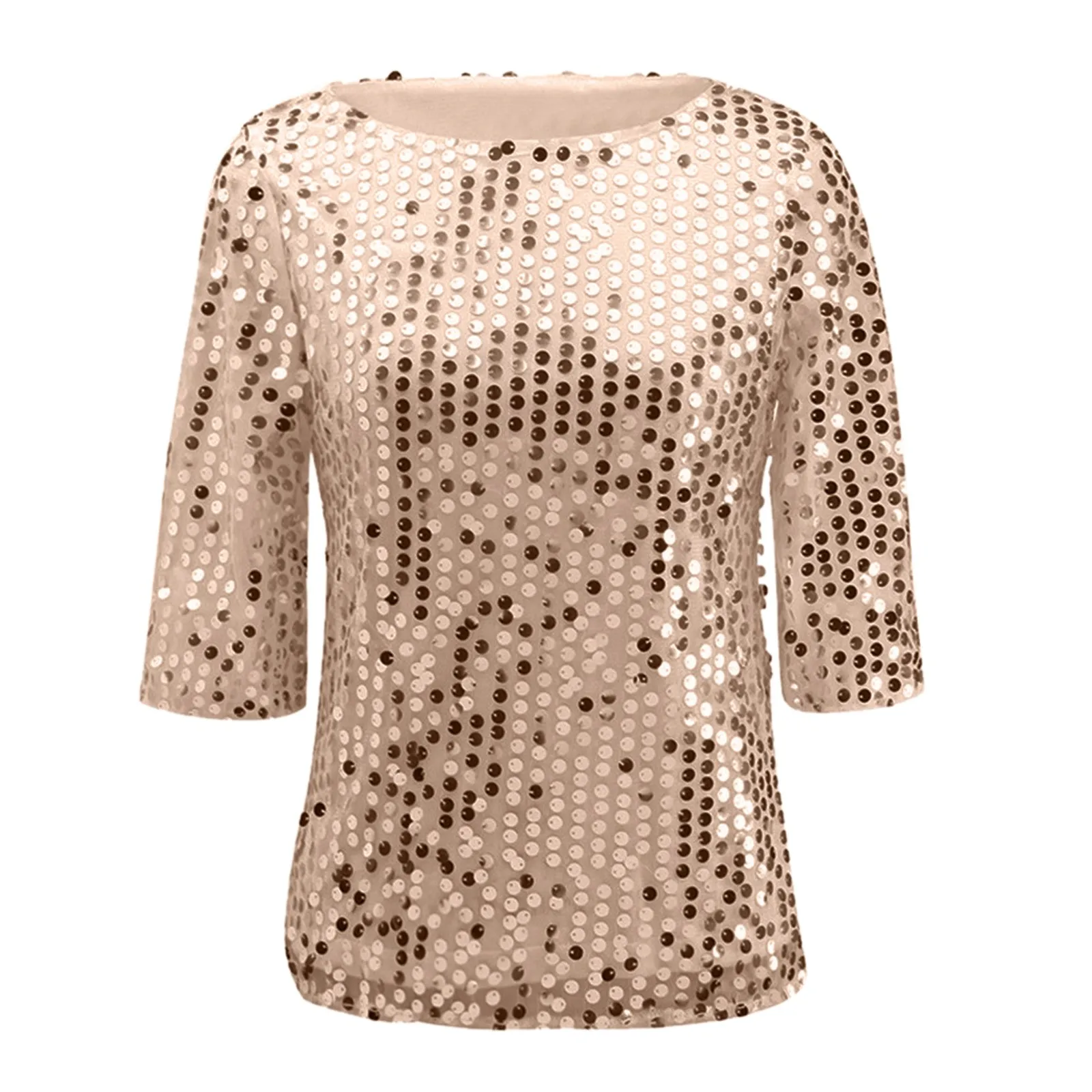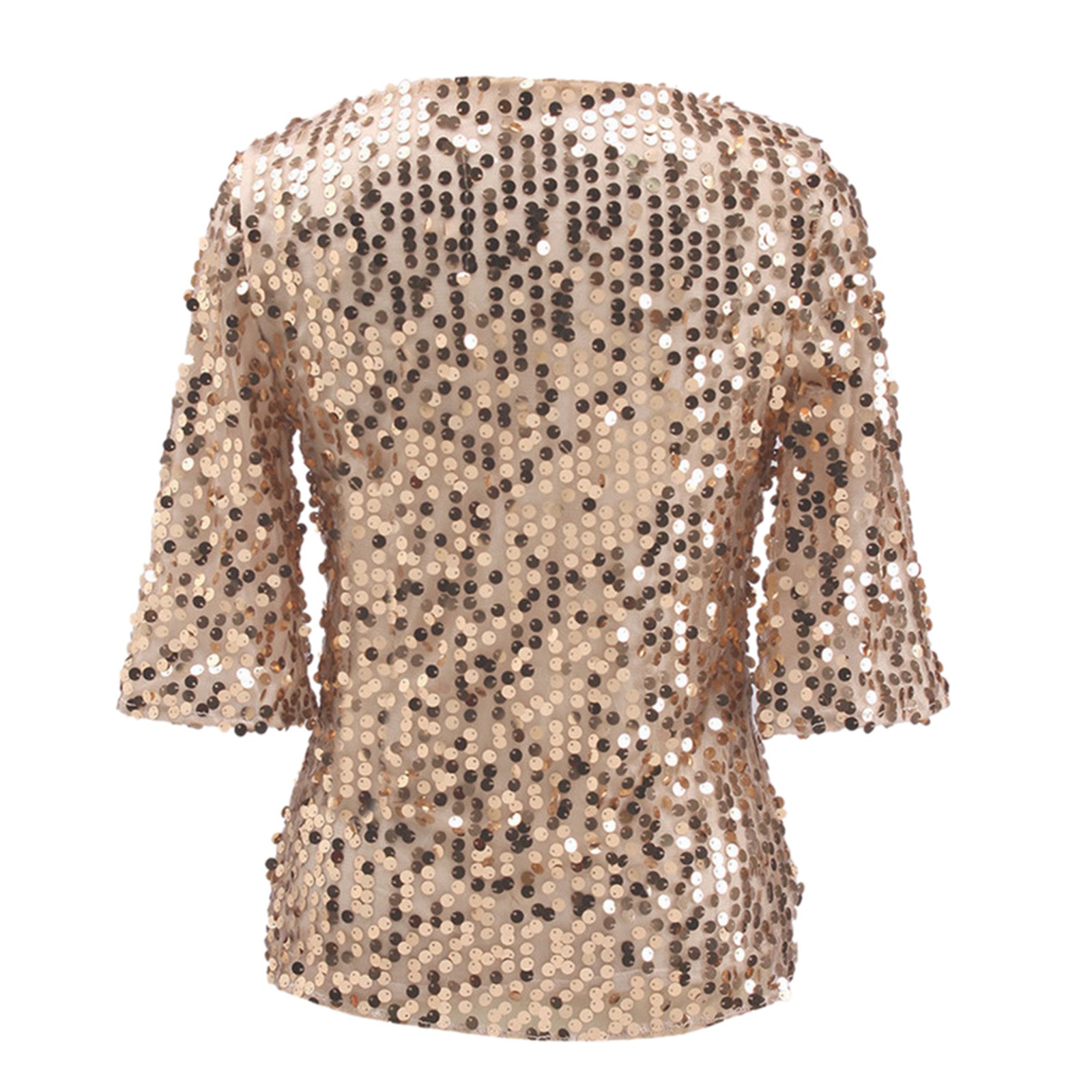 Womens Solid Elegant 1/2 Sleeve O Neck Sequins Shirt Blouse Tops