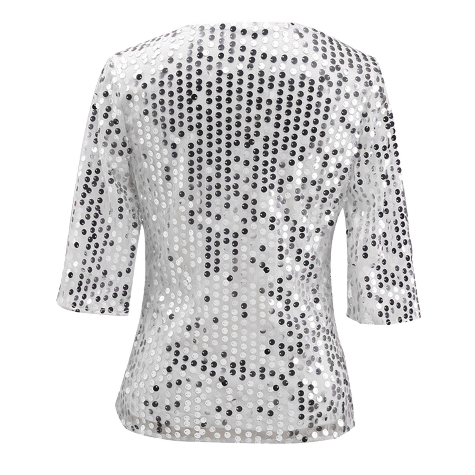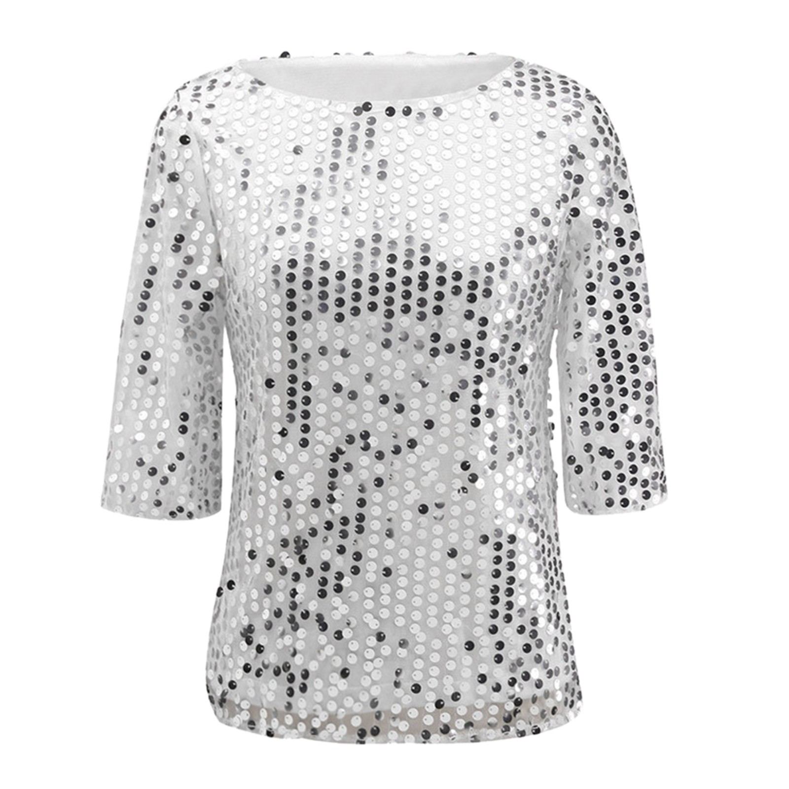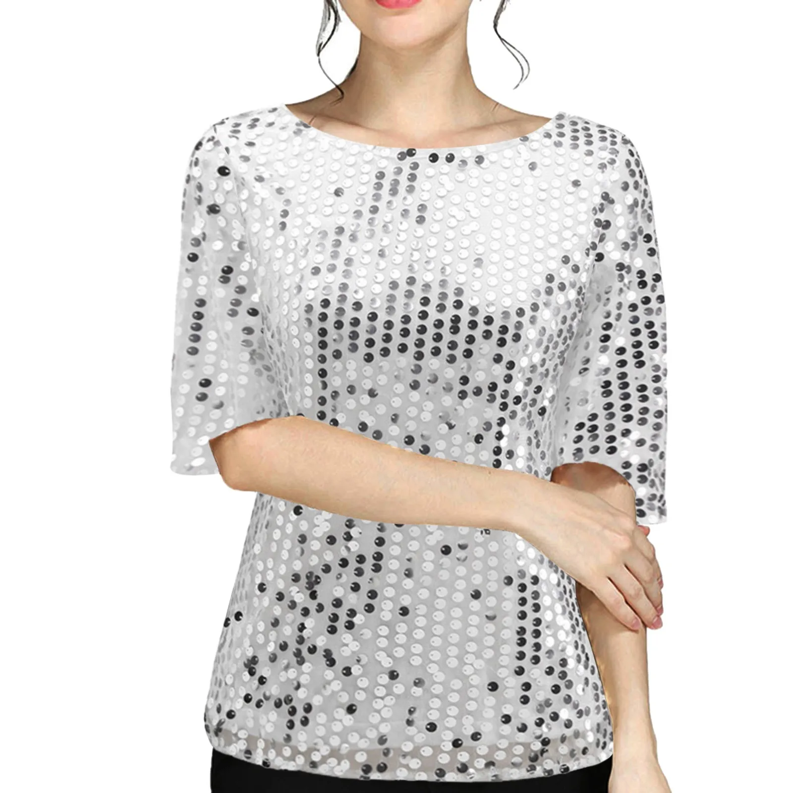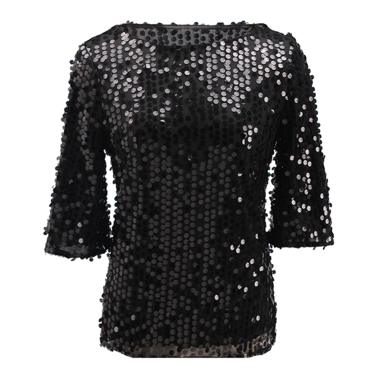 Womens Solid Elegant 1/2 Sleeve O Neck Sequins Shirt Blouse Tops